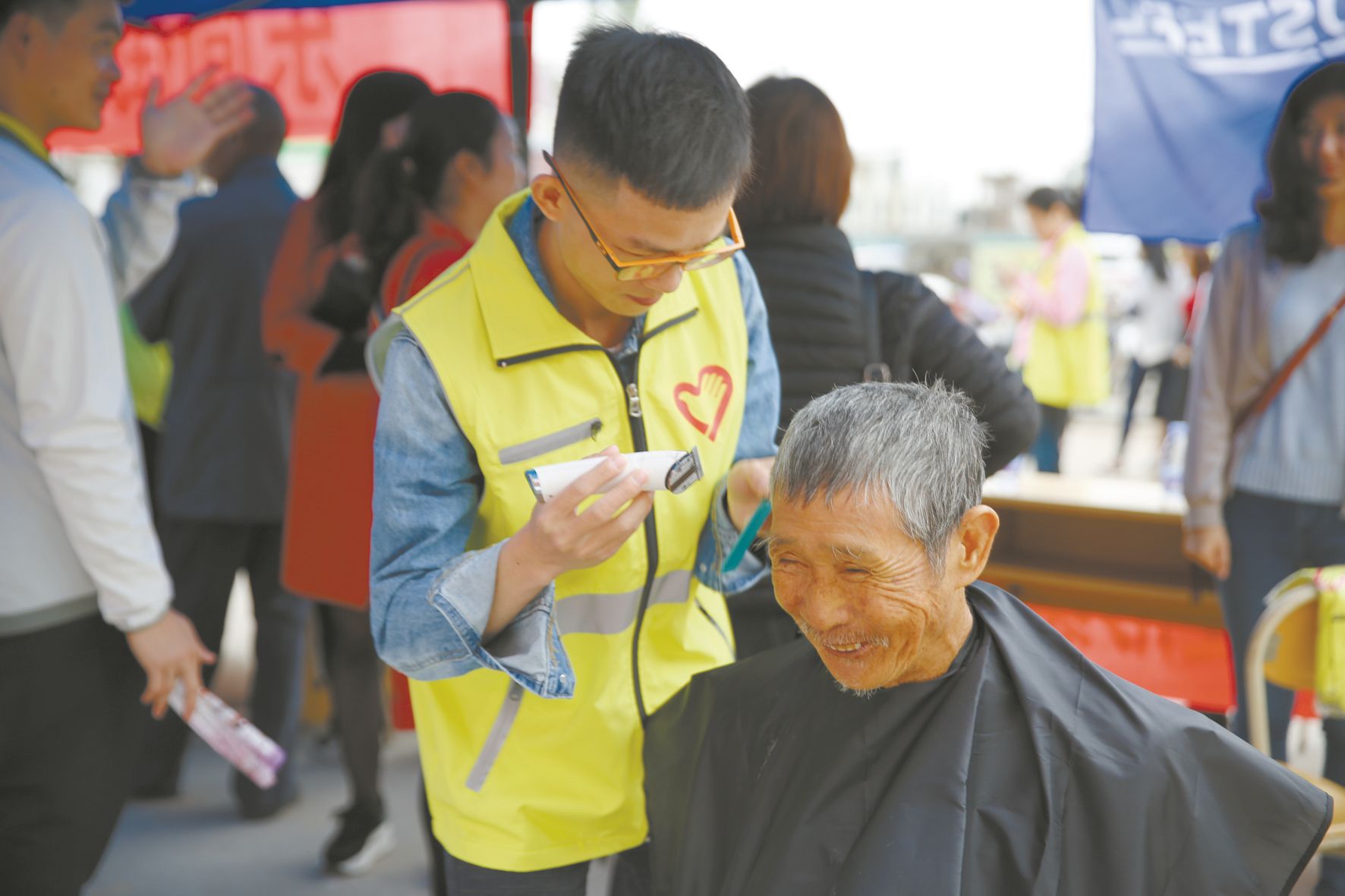 圖為志愿者正在為社區老人理發。(彭翔鳳 攝)
