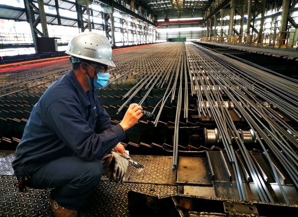 圖為黨員在高棒生產線查看表面質量時情景。(張俊 攝)