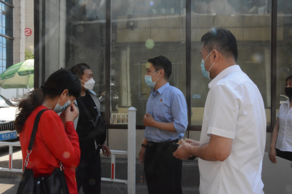 圖為保衛部工會主席董波(右一),保安公司工會主席蘇永鵬(左一)代表職工送去捐款。