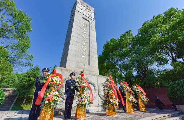 鄰近的革命烈士陵園內,莊嚴肅穆,烈士紀念碑前,全體人員整齊列隊、駐足凝視。敬獻花籃儀式正式開始,全場齊聲高唱《中華人民共和國國歌》。國歌唱畢,全體默哀,向為中國人民解放事業和共和國建設事業英勇獻身的烈士致以崇高敬意。