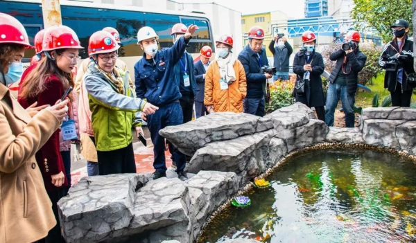 參觀完深度水處理站,專家組和媒體記者團一行乘車來到了企業終端水處理站。映入眼簾的藍色幕墻上,清澈的水正傾瀉而下宛若“瀑布”一般,下方水池中魚兒歡快暢游。這就是方大九鋼精心打造的“水簾洞”,也是企業節水護水的見證。工作人員介紹說,從上方流下來的水就是處理后的工業廢水。當前,方大九鋼噸鋼廢水排放量為0.41立方米,遠遠低于鋼鐵聯合企業執行標準(噸鋼外排水量<1.8立方米),噸鋼化學需氧量、氨氮、懸浮物排放量均達到鋼鐵行業清潔生產一級標準。與此同時,企業加大回水利用,2021年1—10月份工業用水重復利用率為97.47%,超出國家相關規范中有關生產水重復利用率清潔生產的一級標準,達到國內先進水平,并先后榮獲“九江市用水企業水效領跑者”、“九江市節水型企業”雙榮譽。