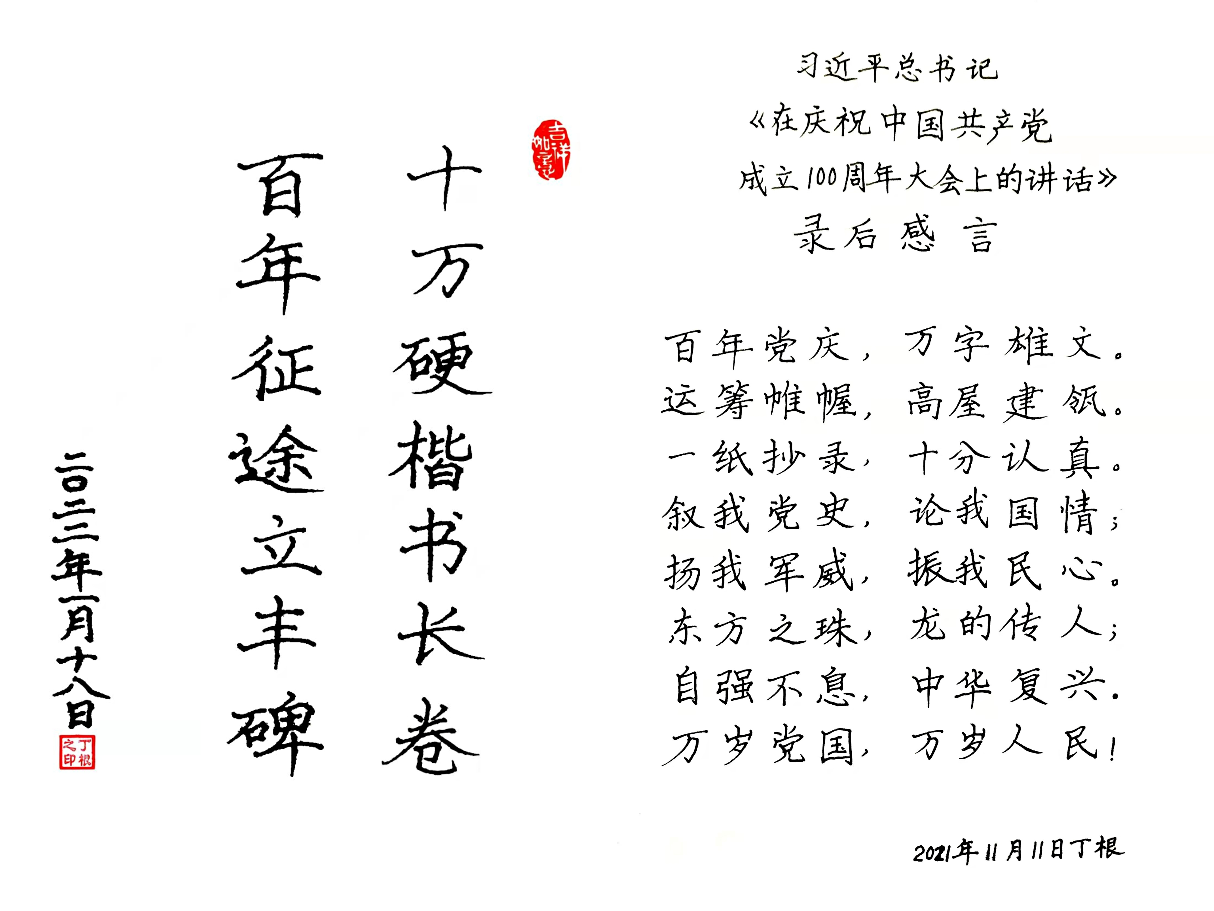“莫把書寫等閑看,無聲黨史頌千秋。”丁根決心在方塊漢字中一筆一畫傳播黨史,記錄中國共產黨的百年輝煌華章,百年浴血奮斗。學史明理,學史增信,學史崇德,學史力行,以自己特殊方式將黨史載入中華民族悠久燦爛的史冊中。