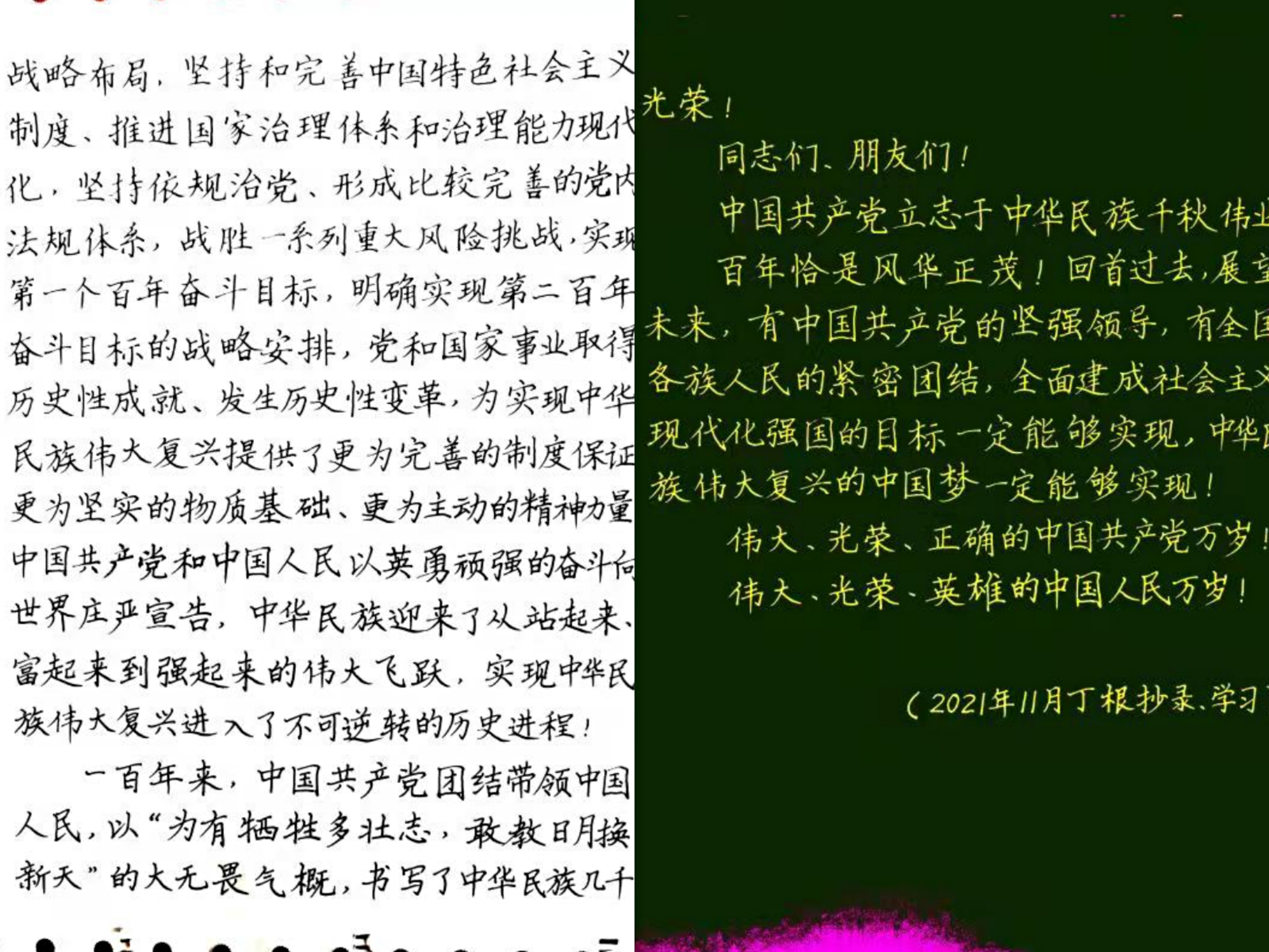 這是丁根的《習近平總書記在慶祝中國共產黨成立一百周年大會上的講話》全文(共計7300多字)手抄稿的照片,長度約4米;后面緊接著是他用鋼筆正楷抄寫的由中共中央黨史和文獻研究院編寫的《中國共產黨一百年大事記(1921年7月-2021年6月)》全文(共計98000多字);整個手抄長卷總計10萬5千多字,總長度近60米。
