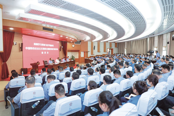 5月18日,南鋼召開學習貫徹習近平新時代中國特色社會主義思想主題教育讀書班開班動員會。江蘇省南京市國資委一級調研員吳軍出席會議并講話,南鋼黨委書記、董事長黃一新做動員講話。圖為讀書班開班動員會現場。 (記者 邵啟明/文 通訊員 朱潤豐/攝)