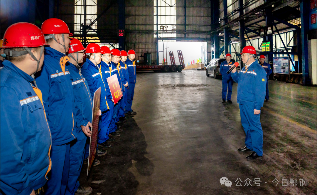 1月17日,鄂城鋼鐵公司領導陸隆文、曾撼宇來到煉鐵廠2#高爐爐臺為煉鐵廠全體干部職工送來高爐檢修提前竣工順利達產喜報和獎勵,鼓勵大家再接再厲,一鼓作氣,堅持以鐵成本為核心,以高爐順行為關鍵,不斷追求極致高效率、極致高效益、極致低成本,以優異業績為公司轉型升級助推高質量發展再做新貢獻。