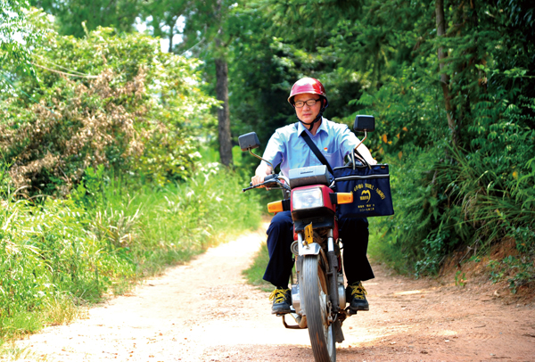 圖為吳建輝騎摩托車專程核查貧困戶的路上。