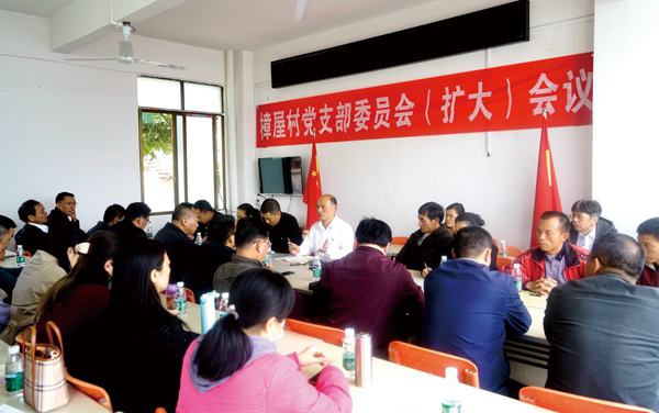 圖為吳建輝(白色衣服)參加樟屋村黨支部委員會(擴大)會議。