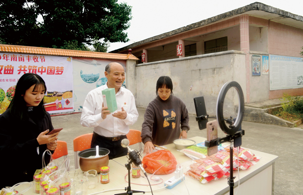 圖為吳建輝(中)在為南畝鎮扶貧產品直播帶貨。