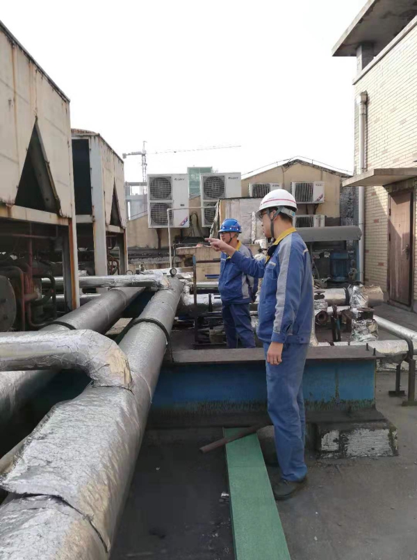 圖為10月28日,該分廠組織有關人員對總廠集控樓熱水管道進行安全隱患排查。