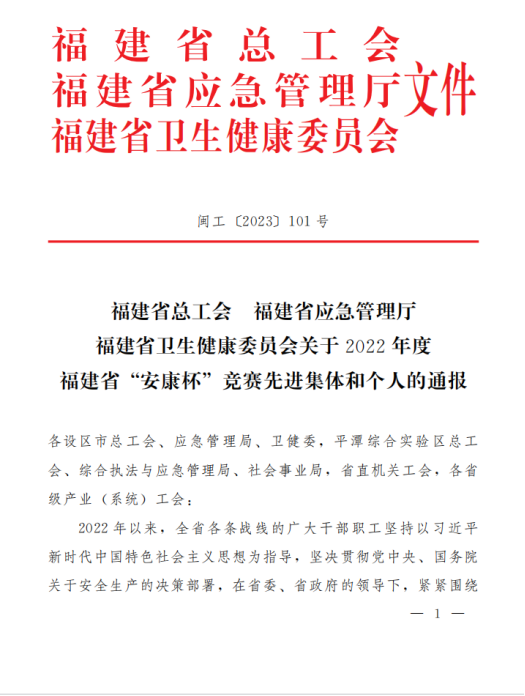 9月13日,福建省總工會、福建省應(yīng)急管理廳、福建省衛(wèi)生健康委員會聯(lián)合印發(fā)《關(guān)于2022年度福建省“安康杯”競賽先進(jìn)集體和個人的通報》,中國一冶福州公司獲評先進(jìn)集體榮譽(yù)稱號。