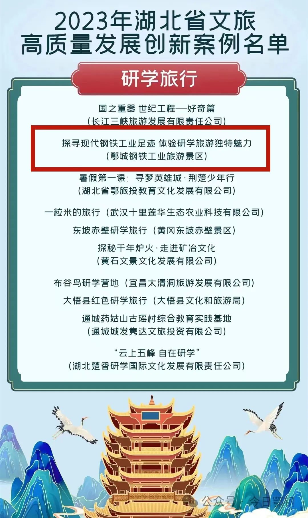 為深入貫徹落實(shí)湖北省旅游發(fā)展工作會(huì)議精神,為全省文旅高質(zhì)量發(fā)展創(chuàng)典型、樹(shù)標(biāo)桿,在湖北省文化和旅游廳指導(dǎo)下,極目新聞聯(lián)合大楚網(wǎng)開(kāi)展“湖北省文旅高質(zhì)量發(fā)展創(chuàng)新案例評(píng)選”活動(dòng)?;顒?dòng)自2023年9月啟動(dòng)后,鄂鋼精心策劃,挖掘展示景區(qū)研學(xué)案例,經(jīng)過(guò)線上投票和專家評(píng)審等環(huán)節(jié),被評(píng)為“2023年湖北省文旅高質(zhì)量發(fā)展創(chuàng)新案例”。