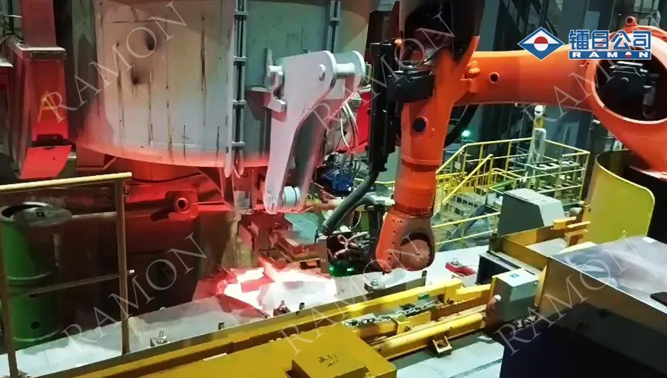 新余鋼鐵集團有限公司電弧爐產線采用“廢鋼/鐵水→電弧爐→精煉→連鑄→軋鋼”的短流程工藝路線,實現了流程的集約優化和資源的高效利用,產線智能化程度高。鐳目公司與新鋼集團電弧爐項目部深度合作,共同開發了智能連鑄澆鋼平臺,并將其應用于新鋼集團電弧爐項目的連鑄環節,旨在打造智慧連鑄集群。鐳目1#鑄機智能連鑄澆鋼平臺于2024年6月底開始進行調試,7月15日完成設備冷試,7月18日與新鋼電爐項目共同完成熱負荷試車,并一次性熱試成功。僅20天,刷新了該項目從安裝調試、冷試到一次熱試的最快紀錄,獲得客戶高度認可。鐳目智能連鑄澆鋼平臺集成了機器人及周邊輔助設備,能夠全面實現自動裝/拆滑板油缸、自動介質管道套接、自動裝/拆大包長水口、自動添加中間包保溫覆蓋劑、自動測溫取樣等一系列操作。借助機器人及機器視覺技術,系統能夠精準執行大包滑板油缸、長水口的自動裝拆動作。同時,結合特制的工裝夾具,平臺還能實現中包測溫取樣、加覆蓋劑等關鍵步驟,從而實現了鑄機大包澆鋼過程中的全智能化、自動化。這一創新不僅將一線工人從高溫、高危、高強度的復雜工況中解放出來,還完美結合了人性化與智能化,為鋼鐵生產帶來了全新的變革。
