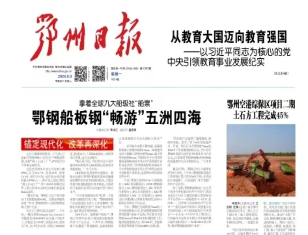 近日,《鄂州日報》頭版頭條刊發了《拿著九大船級社“船票”,鄂鋼船板鋼“暢游”五洲四海》文章