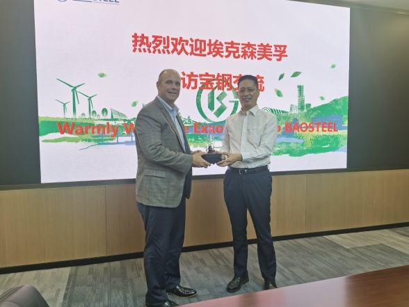 在寶鋼股份指揮中心,雙方圍繞未來合作發展進行了熱烈而深入的交流。寶鋼股份董事兼總經理吳小弟首先和大家介紹了寶鋼股份近年來的穩健發展勢頭與前景展望。他表示,“寶鋼股份作為行業領軍者,始終堅持向‘高端化、智能化、綠色化’的發展方向邁進,也因此在鋼鐵下游需求低迷的市場情況下,實現了自身業績的穩定增長,還帶動了全產業鏈的升級優化。展望未來,寶鋼股份將繼續響應國家戰略,深化與埃克森美孚等國際伙伴的緊密合作,共同探索鋼鐵行業的綠色化、高質量發展新路徑。”