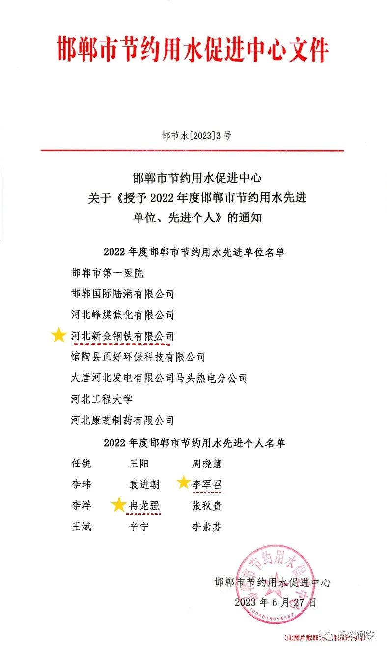 為樹立典范,弘揚(yáng)先進(jìn),充分調(diào)動社會各界參與節(jié)約用水工作的積極性和主動性,邯鄲市水利局在全市范圍內(nèi)開展2022年度節(jié)水先進(jìn)單位和先進(jìn)個(gè)人的評選活動。授予新金鋼鐵“2022年度邯鄲市節(jié)水先進(jìn)單位”榮譽(yù)稱號,同時(shí)授予公司節(jié)水管理負(fù)責(zé)人冉龍強(qiáng)、李軍召“2022年度邯鄲市節(jié)水先進(jìn)個(gè)人”榮譽(yù)稱號。