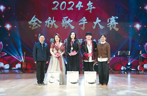 圖為2024金秋歌手大賽暨聲樂百冠賽前三名獲獎選手上臺領獎。