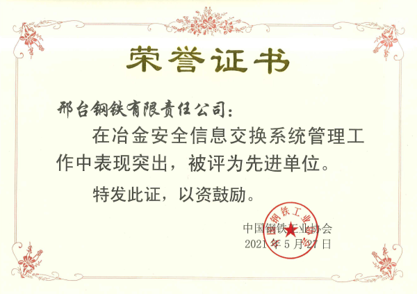 近日,邢臺鋼鐵有限責任公司(以下簡稱邢鋼)收到中鋼協〔2021〕73 號文《關于表彰冶金安全信息交換系統管理工作先進單位和先進個人的決定》及榮譽證書,邢鋼在冶金安全信息交換系統管理工作中表現突出,被評為先進單位。