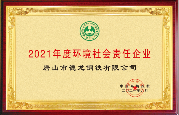 近日,由中國環境報社主辦的“2021中國環境社會責任論壇暨六五環境日宣傳海報首發式”在京召開。會議對環境保護工作有突出貢獻的企業進行了表彰,唐山德龍再次榮獲“環境社會責任企業”稱號。
