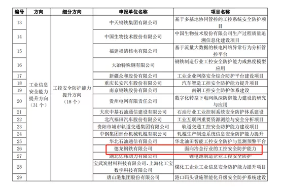 近日,國家工信部完成2021年新一代信息技術與制造業融合發展試點示范名單公示。經企業自主申報、地方推薦及專家評審等環節,全國遴選出工業信息安全能力提升方向31個(其中:工控安全防護能力提升方向18 個)示范單位。德龍鋼鐵依托自身在工業控制領域的沉淀和新一代信息技術的全面融合,“面向冶金行業的工控安全防護”項目成功入圍,標志著企業工控能力及成效建設獲得國家與行業的認可。