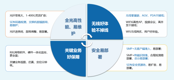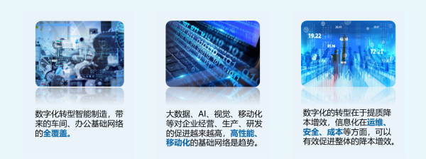 第一,高帶寬。光纖鏈路全萬兆,延伸到班組,便于以后隨時擴容網絡;車間部署支持Wi-Fi 6協議的高密AP,提升3倍的容量性能,支持光纖接入,跨過100米的網線限制,可在車間任意點位部署;
