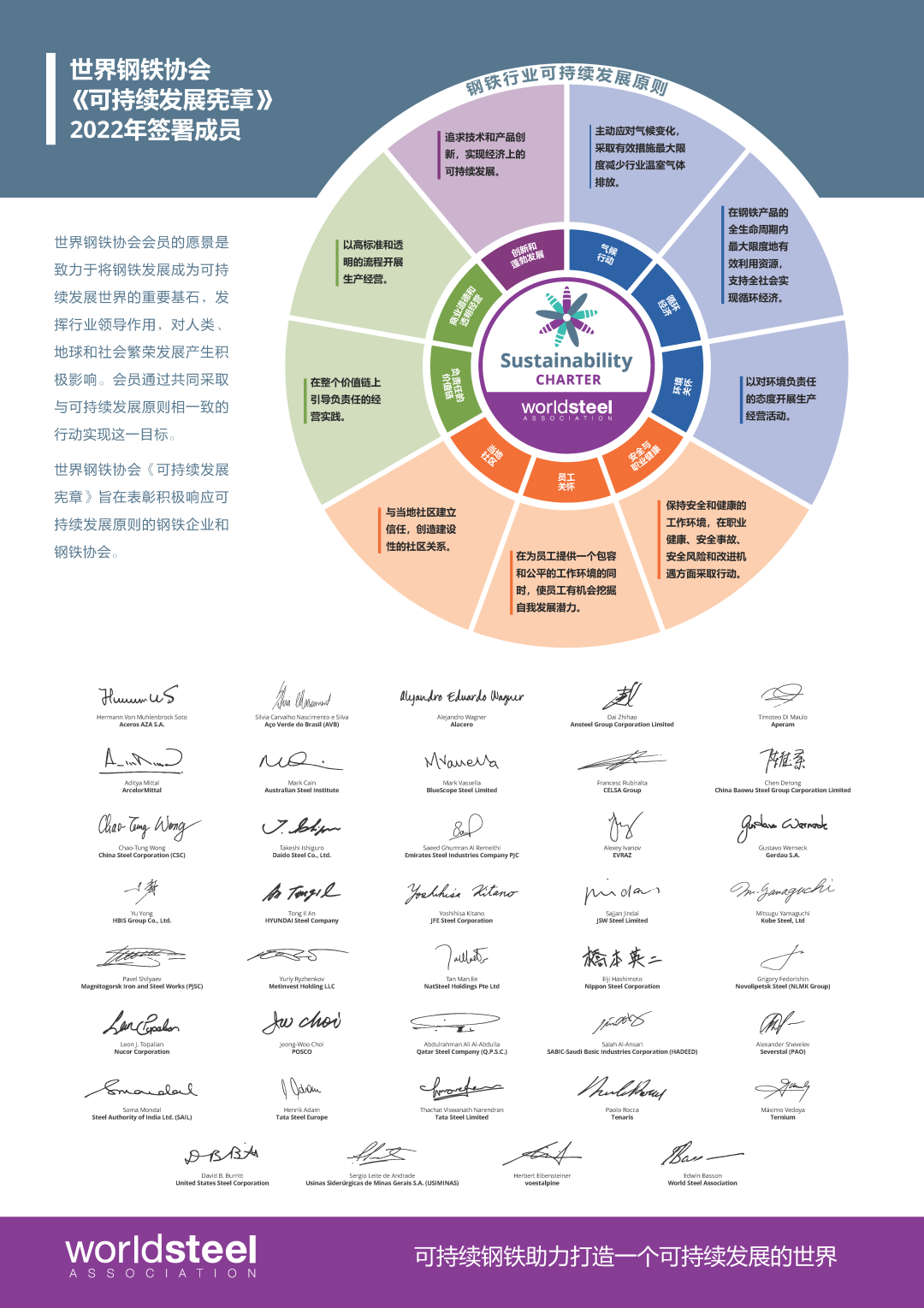 世界鋼鐵協(xié)會(huì)《可持續(xù)發(fā)展憲章》于2009年首發(fā),每三年評(píng)審和修訂一次,新版《可持續(xù)發(fā)展憲章》包括9項(xiàng)可持續(xù)發(fā)展原則及其20條標(biāo)準(zhǔn),內(nèi)容涵蓋應(yīng)對(duì)氣候變化行動(dòng)、循環(huán)經(jīng)濟(jì)、安全與健康、商業(yè)道德、創(chuàng)新與經(jīng)濟(jì)繁榮等多個(gè)領(lǐng)域,反映鋼鐵行業(yè)對(duì)可持續(xù)發(fā)展的關(guān)注度日益提升,以及對(duì)人類、我們的地球和社會(huì)繁榮產(chǎn)生積極影響所擔(dān)負(fù)的責(zé)任。