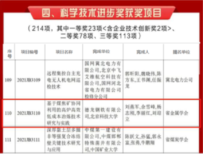 經2021年度河北省自然科學獎、技術發明獎、科學技術進步獎總評,共推薦建議授獎項目253項。其中:省自然科學獎21項,其中一等獎3項、二等獎7項、三等獎11項;省技術發明獎18項,其中一等獎3項、二等獎6項、三等獎9項;科學技術進步獎214項,其中一等獎23項、二等獎78項、三等獎113項。其中,由德龍鋼鐵有限公司,北京科技大學共同完成的《基于煤焦礦協同利用的高爐高效低成本冶煉技術研究與實踐》項目,獲得河北省科學技術進步獎三等獎,該項目完成人為德龍鋼鐵劉燕軍、北京科技大學佘雪峰等人。