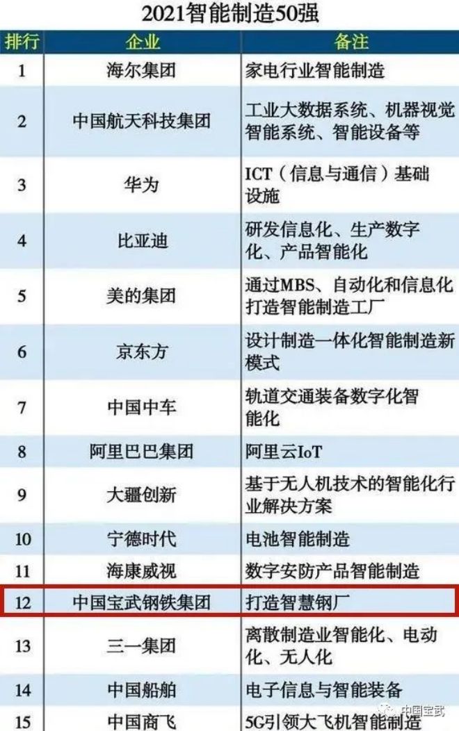 近日,中國科學院《互聯網周刊》、eNet研究院、德本咨詢聯合發布2021中國智能制造50強排行榜。寶武作為唯一一家鋼鐵企業入選,排名12,比2020年提升18位。