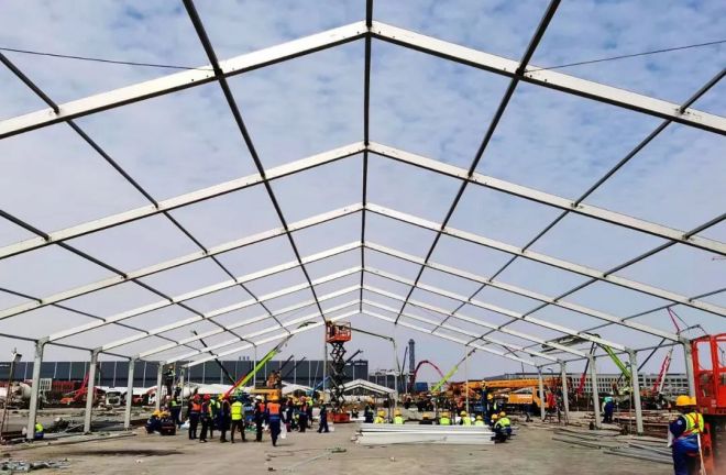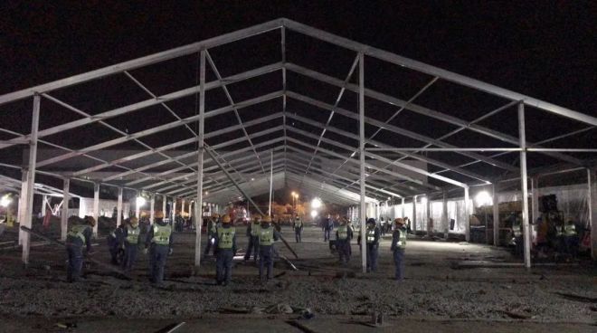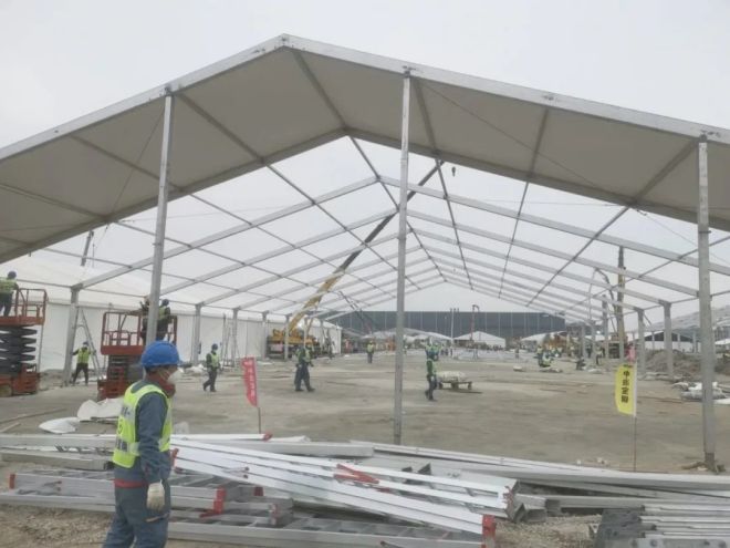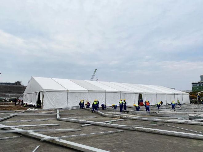 4月16日早上7時7分,現(xiàn)場作業(yè)人員調(diào)整為5個班組,在四臺垂直登高車的協(xié)同流水作業(yè)下,B區(qū)第一榀屋架順利安裝就位。8時35分,B—13病患帳篷鋼結(jié)構(gòu)全部安裝完畢。9時至12時經(jīng)過3個小時的奮戰(zhàn),B—13病患帳篷的篷布全部鋪設(shè)完畢,標志著方艙建設(shè)的第一頂帳篷在不到12小時內(nèi)全部安裝完畢。不僅詮釋了“冶金建設(shè)國家隊”的鐵軍速度,也展示了中國二十冶建設(shè)者頑強不屈的精神和責(zé)任擔(dān)當(dāng)。目前現(xiàn)場的后續(xù)帳篷安裝作業(yè)仍在緊張進行中。