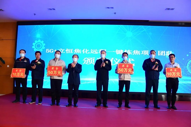 儀式上,韓珍堂、于樂、鄭家平、張?zhí)旄?G+立恒焦化遠(yuǎn)程一鍵煉焦項(xiàng)目團(tuán)隊(duì)負(fù)責(zé)人頒獎(jiǎng)。