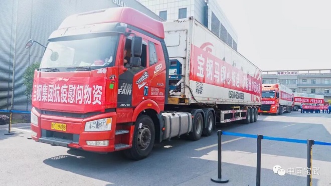 是日一早,3輛滿載抗疫保產(chǎn)慰問(wèn)物資的大卡車在馬鋼廠區(qū)集結(jié)完畢?!皩氫擇R鋼心相連 共克時(shí)艱一家親”等車身上的標(biāo)語(yǔ),在明媚陽(yáng)光的照耀下格外醒目。60余萬(wàn)元防暑降溫抗疫保產(chǎn)慰問(wèn)物資在滬皖兩地寶武人的共同努力下,將在最短時(shí)間內(nèi)趕赴上海,用以支援寶鋼股份抗疫保產(chǎn)。