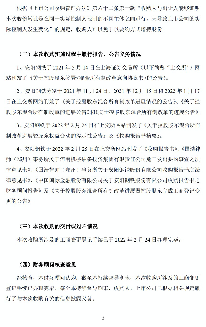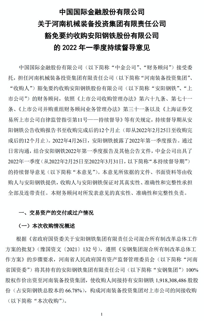 5月10日,安陽鋼鐵發布了《中國國際金融股份有限公司關于河南機械裝備投資集團有限責任公司豁免要約收購安陽鋼鐵股份有限公司的2022年一季度持續督導意見》公告(以下簡稱公告)。