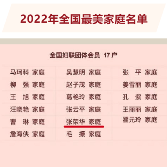 據(jù)全國(guó)婦聯(lián)官方微信公眾號(hào)消息:在5月15日國(guó)際家庭日來(lái)臨之際,全國(guó)婦聯(lián)表彰997戶全國(guó)五好家庭,200個(gè)全國(guó)家庭工作先進(jìn)集體,198名全國(guó)家庭工作先進(jìn)個(gè)人,揭曉997戶全國(guó)最美家庭。榮程集團(tuán)董事會(huì)主席張榮華家庭獲評(píng)全國(guó)最美家庭。