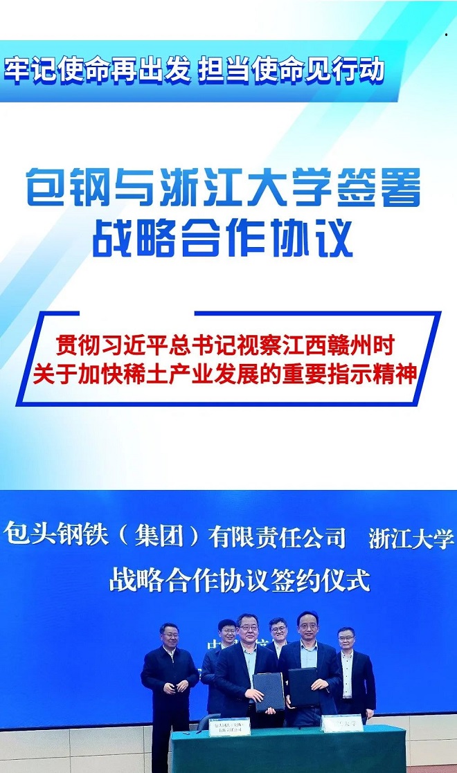 5月20日,在紀念習近平總書記視察江西贛州三周年、全國稀土行業重溫習近平總書記重要指示精神之際,包鋼(集團)公司、浙江大學戰略合作協議簽約儀式在浙江大學舉行。此舉旨在深入貫徹落實總書記重要指示精神,構建產學研用深度融合的創新聯合體,引領和推動我國稀土產業高質量發展。