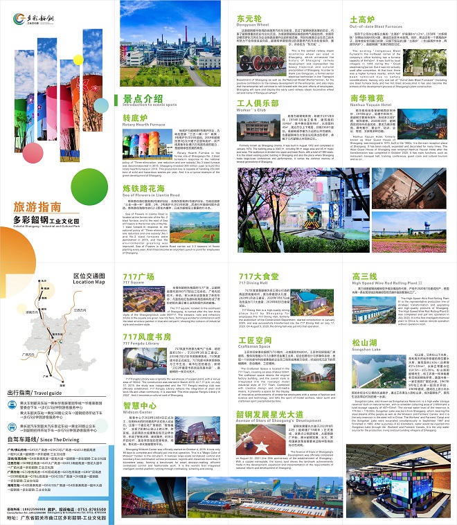 “多彩韶鋼—工業文化園”旅游資源銜接自然,相互拓展,相互延伸,形成層次多樣的資源空間組合。主要景點有:轉底爐、煉鐵路花海、717廣場、717風度書房、韶鋼智慧中心、韶鋼發展星光大道、高三線、松山湖、東元輪、土高爐、工人俱樂部、南華雅苑等,設計的線路有多彩工業文化旅游線、工業科普藝術觀光線、歷史文化景觀游覽線等三條線路。