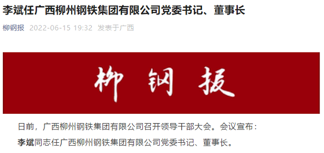 6月15日,從廣西柳州鋼鐵集團官方微信獲悉,日前,廣西柳州鋼鐵集團有限公司召開領導干部大會。會議宣布: