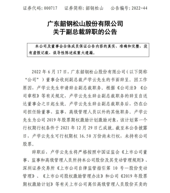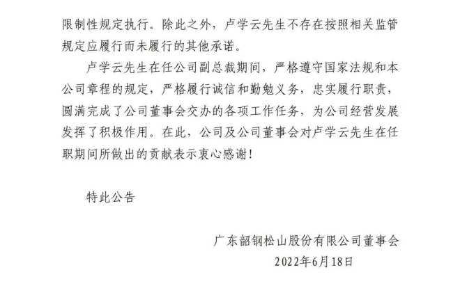 2022年6月17日,廣東韶鋼松山股份有限公司董事會收到副總裁盧學云的書面辭呈。因工作原因,盧學云申請辭去副總裁職務(wù)。根據(jù)《公司法》《公司章程》等有關(guān)規(guī)定,盧學云辭去副總裁職務(wù)的辭呈自送達董事會之日起生效。