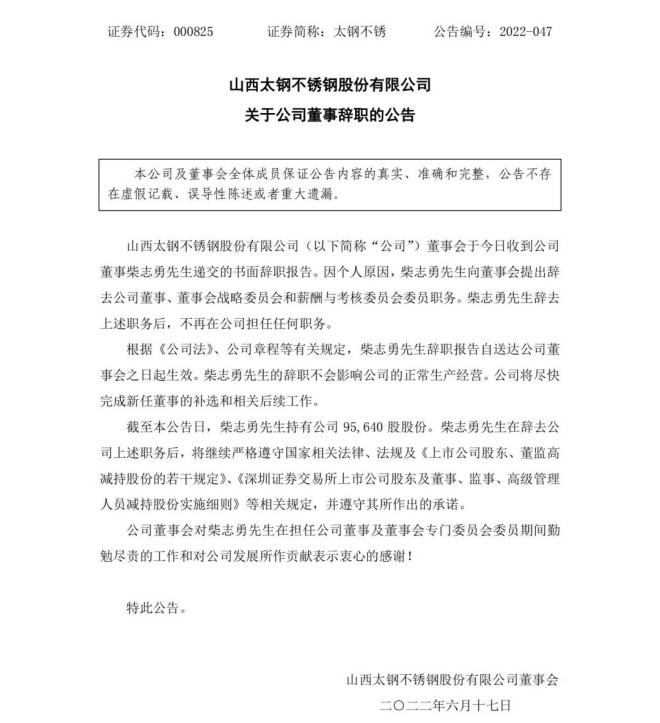 同一天,山西太鋼不銹鋼股份有限公司董事收到公司(以下簡稱公司)董事柴志勇遞交的書面辭職報告。因個人原因,柴志勇向董事會提出辭去公司董事、董事會戰(zhàn)略委員會和薪酬與考核委員會委員職務(wù)。柴志勇辭去上述職務(wù)后,不再在公司擔任任何職務(wù)。根據(jù)《公司法》、公司章程等有關(guān)規(guī)定,柴志勇辭職報告自送達公司董事會之日起生效。