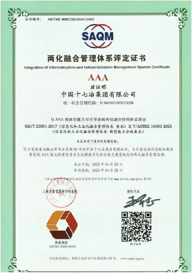 6月15日,中國十七冶集團收到國家工信部頒發的兩化融合最高等級AAA級證書,成為安徽省首個通過兩化融合管理體系AAA級評定的建筑業企業。