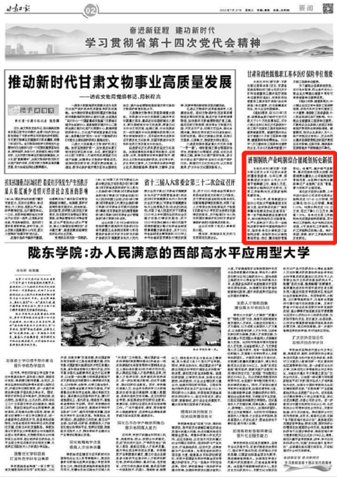 近日,甘肅日?qǐng)?bào)發(fā)表文章《酒鋼鋼鐵產(chǎn)業(yè)噸鋼綜合能耗創(chuàng)歷史新低》,報(bào)道了酒鋼集團(tuán)宏興股份公司大力開展節(jié)能降碳工作,噸鋼綜合能耗創(chuàng)歷史新低,主要工序能耗均完成國(guó)家能耗限額標(biāo)準(zhǔn)的情況。(詳情點(diǎn)擊鏈接:https://shuzibao.gansudaily.com.cn/pc/layout/202207/27/node_02.html)