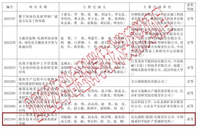 近日,中國鋼鐵工業(yè)協(xié)會發(fā)布公告,經嚴格評審,共111個項目被授予2022年中國鋼鐵工業(yè)協(xié)會、中國金屬學會冶金科學技術獎。其中,包鋼集團獲二等獎一項,三等獎兩項。