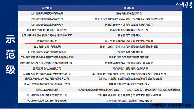近年來,德龍鋼鐵始終堅持以“創新德龍”管理模式為抓手,以產品質量提升和創新驅動為引領,針對客戶需求與技術難題,通過搭建創新研發平臺,強化獨立創新、合作創新、引進再創新,形成了系統的科技創新體系。本次參與評審的《低碳鋼連鑄坯角部橫裂紋控制技術》《熱軋中寬帶表面氧化鐵皮缺陷控制技術研究》等4項成果,以及合理運用各種質量管理工具,對存在的技術難點進行系統分析,并集中力量開展工藝優化和質量改進活動,提升了產品質量,為公司創造了可觀的經濟價值和社會價值。