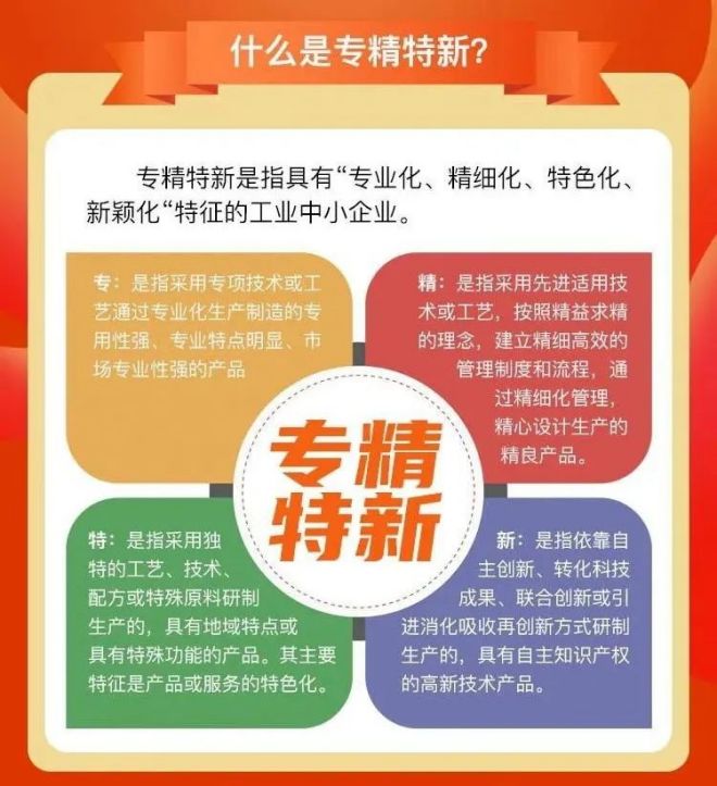 國家級專精特新“小巨人”企業的篩選和審核由工信部負責,是國家為鼓勵中小企業實現專業化運營、精細化產出、特色化工藝和新穎化產品四方面發展而專門設立的榮譽獎項,同時也是全國中小企業評定工作中最高等級、最具權威的榮譽稱號。評選的企業均是專注于細分市場、創新能力強、市場占有率高、掌握關鍵核心技術、成長性高的“排頭兵”企業。