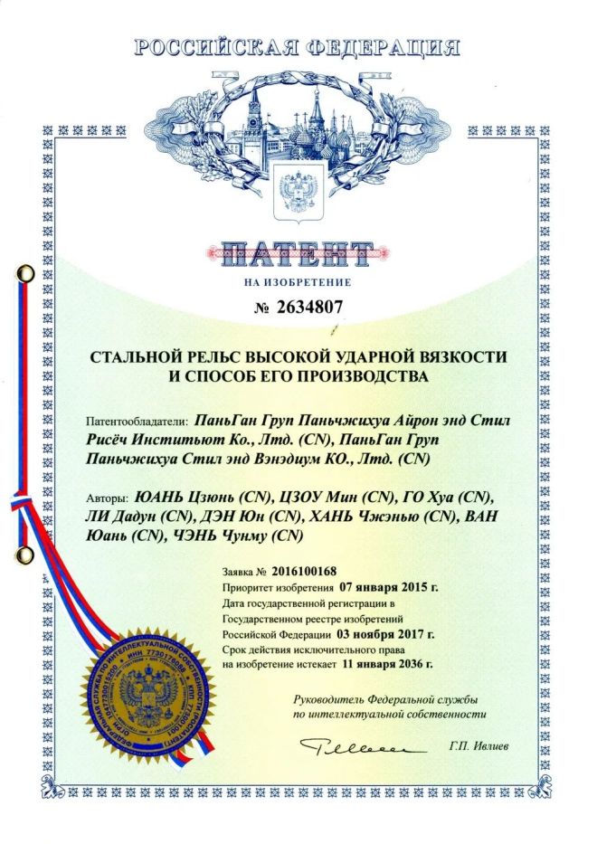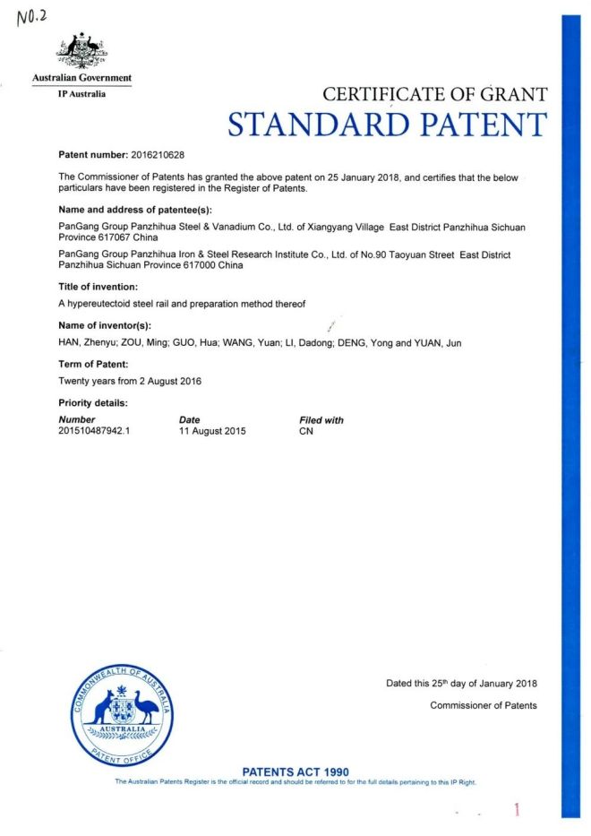 近日,小編得到最新信息:攀鋼收到了澳大利亞專利局發來的《控制中上限Mn含量R350HT鋼軌閃光焊接接頭組織的工藝》專利授權證書。目前,攀鋼在鋼軌領域獲得的授權國際專利已超過40項。