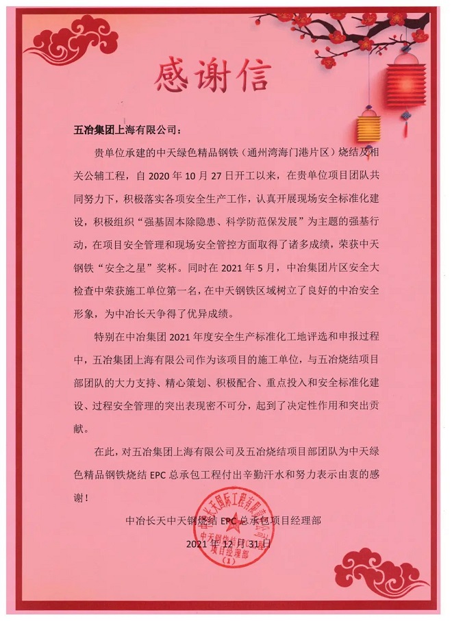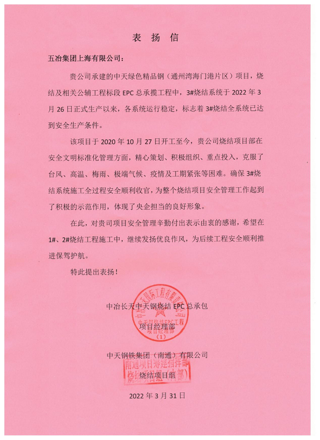2022年8月27日上午9時,隨著紅礦在1#燒結機臺車上緩緩駛出,中天綠色精品鋼燒結項目的三條燒結系統均已達到安全投產條件,整個項目也進入了收尾階段。歷經22個月的艱苦奮戰,項目團隊對標國際最高標準、最好水平,盡最大努力將項目打造成讓業主滿意的優質工程,在項目安全管理和現場安全管控方面取得了諸多成績,榮獲中天鋼鐵“安全之星”獎杯,在中冶集團中天綠色精品鋼安全生產大檢查中榮獲施工單位第一名,樹立了良好的五冶安全形象。此外,三臺燒結機同步建設在冶金工業建筑領域是一次重要的突破,充分展現了中國五冶集團冶金建設國家隊的品牌實力。萬丈鋼廠平地起,五冶人以一流的管理能力、先進的施工技術,實現完美履約,助力中天綠色鋼城在黃海之濱快速崛起。