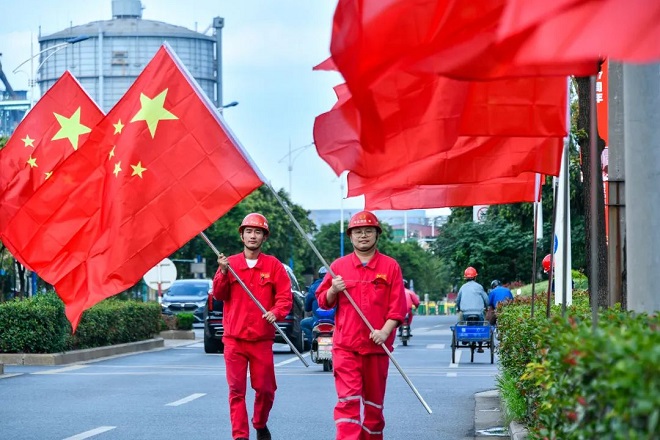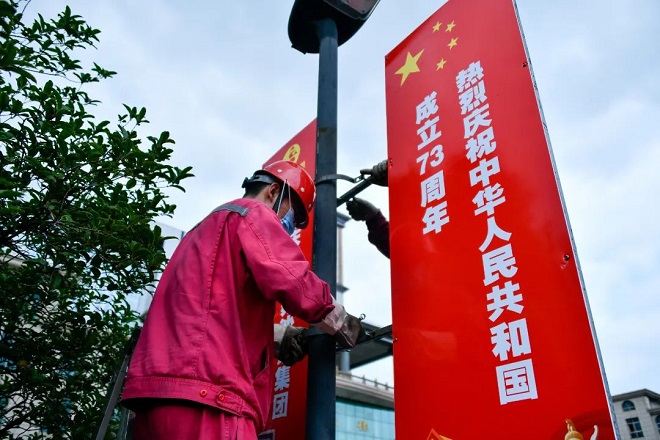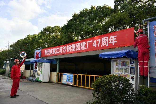 五星紅旗迎風招展,在職工的巧手裝扮下,“中國紅”漫卷十里鋼城?!矮I禮二十大 永遠跟黨走”“熱烈慶祝中華人民共和國成立73周年”以及“熱烈慶祝江蘇沙鋼集團建廠47周年”的宣傳標語在十里鋼城閃耀著奪目光華,與茂密的樹叢及綠植交相輝映,在藍天的映襯下顯得格外鮮艷。