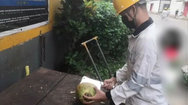 圖|印尼小伙勞比在為中國師傅加工椰子