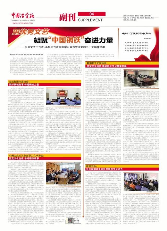冶金行業、冶金企業文聯(文協)作為聯系廣大冶金職工文化工作者和基層文藝創作者的橋梁和紐帶,承擔著團結引導廣大冶金文化工作者和基層文藝創作者聽黨話、跟黨走的政治責任,承擔著培根鑄魂的光榮使命。連日來,冶金文學藝術協會、中國冶金作協各級會員企業,組織行業、企業會員深入學習貫徹黨的二十大精神,用實際行動貫徹落實黨的二十大報告向廣大文藝工作者提出的新要求,“講好中國故事、傳播好中國聲音,展現可信、可愛、可敬的中國形象”。