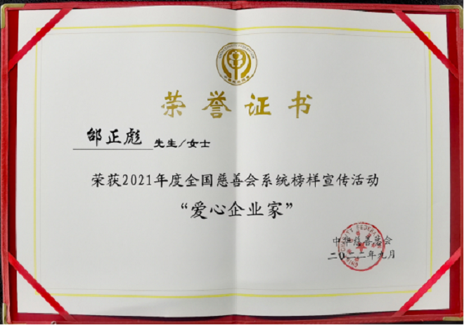 泰爾重工股份有限公司創始人、名譽董事長邰正彪榮獲2021年度全國慈善會評選的“愛心企業家”稱號。