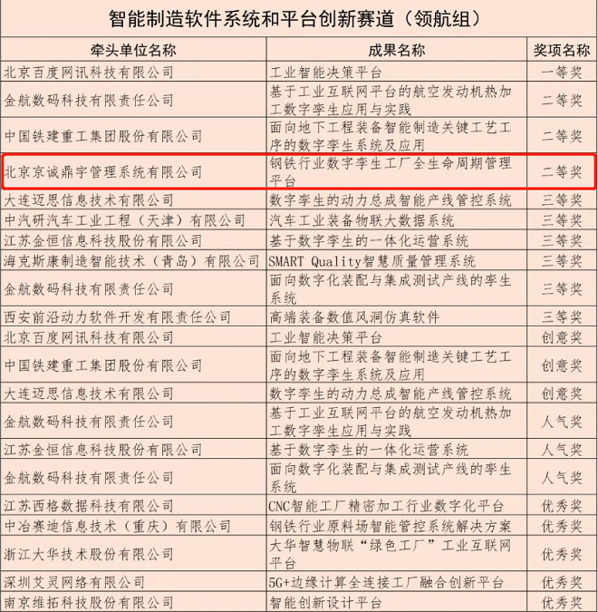 11月23日,以“數(shù)智賦能,鏈通未來”為主題的世界智能制造大會盛大開幕,第二屆智能制造創(chuàng)新大賽頒獎儀式在大會開幕式上隆重舉行。中冶京誠鼎宇公司申報的“鋼鐵行業(yè)數(shù)字孿生工廠全生命周期管理平臺”脫穎而出,榮獲軟件系統(tǒng)與平臺創(chuàng)新賽道高級別組別領航組二等獎,名列鋼鐵行業(yè)參賽作品第一的好成績。