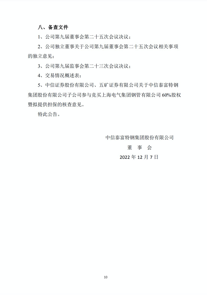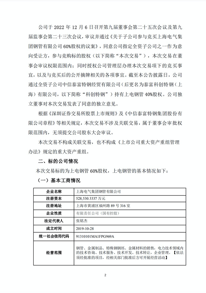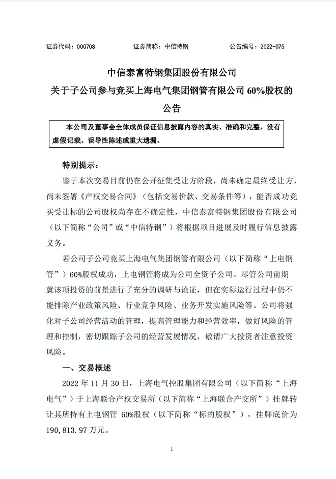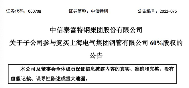 12月7日,中信特鋼發布了《關于子公司參與競買上海電氣集團鋼管有限公司60%股權的公告》(以下簡稱《公告》)。